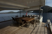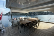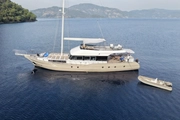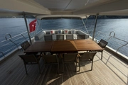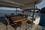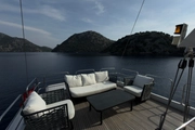 The yacht's open deck is equipped with thoughtfully designed relaxation areas for enjoying the sea and sun. Guests can spend enjoyable hours on the spacious sunbathing cushions or experience an active holiday with water sports facilities offered by the yacht, such as canoeing, snorkeling, and fishing equipment.