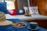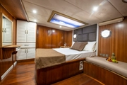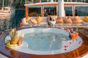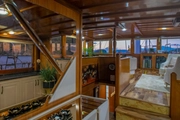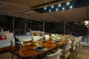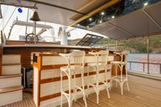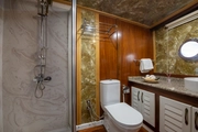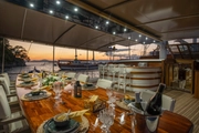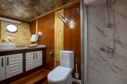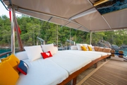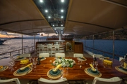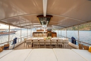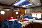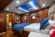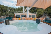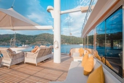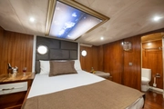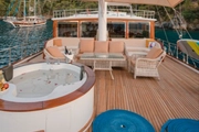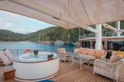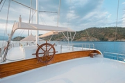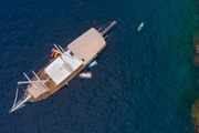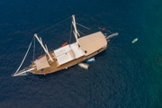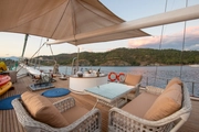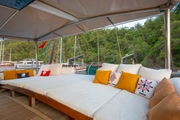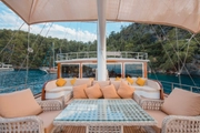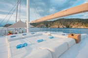 In the outdoor areas, there are large sunbathing cushions, comfortable seating sets, and awnings providing shade. Guests can enjoy delicious Mediterranean cuisine in the specially prepared dining area on the aft deck. The gulet also has a spacious foredeck where guests can sunbathe and enjoy refreshing drinks.