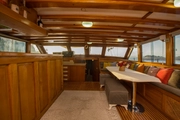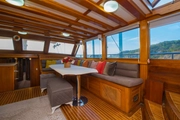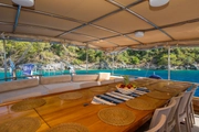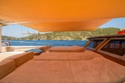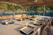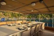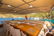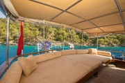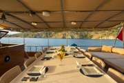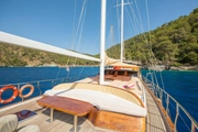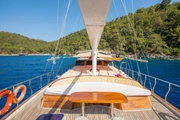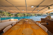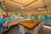 The yacht, where you can feel the warmth and elegance of wood in its interior and exterior design, is equipped with spacious sunbathing areas, a breezy lounge, and a modern kitchen for the comfort of its guests. The outdoor dining area offers an enchanting atmosphere for enjoying delicious meals while savoring the sea and nature.