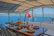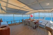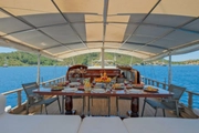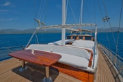 The wide deck of the gulet is a perfect space for sunbathing and relaxation. Guests can enjoy the stunning views while lounging on the sunbeds under the Mediterranean sun or dining at the table on the aft deck. Every detail is carefully planned to maximize your comfort on the water with Pronto White.