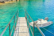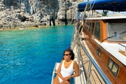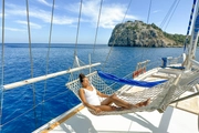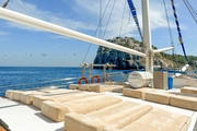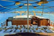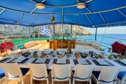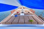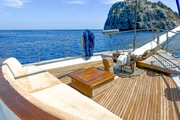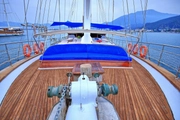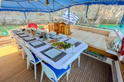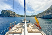 During your blue cruise, a professional crew of four will be at your service to ensure your experience is memorable. The spacious deck of the ship is equipped with sun loungers and comfortable seating areas, ideal for soaking up the Mediterranean sun. As you glide over the azure waters, this area is perfect for cooling off with a refreshing drink under the sun, offering an ideal spot to relax and socialize.