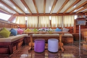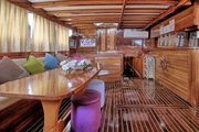 The interiors of V-GO reflect the warmth of woodwork, featuring a large and comfortable lounge adorned with colorful cushions and wooden details. This space allows for comfortable resting or spending quality time with loved ones, equipped with modern conveniences that won't make you miss the comforts of home while at sea.