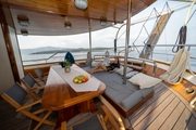 he gulet's spacious open deck areas are ideal for a peaceful reading session or dining and socializing in groups. Equipped with sunbathing areas, outdoor dining tables, and comfortable seating groups, these areas are thoughtfully designed with details that make every moment special, offering relaxation and entertainment against the backdrop of unique landscapes.