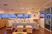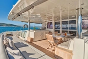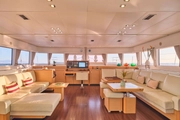 The interior of the yacht provides a spacious and airy living area. The light-colored decoration and wooden details create a modern and warm atmosphere, while the large windows fill the space with natural light. Comfortable seating arrangements, a dining table, and entertainment systems in the lounge ensure the comfort of your home on the sea.