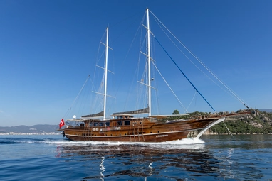 The Kaya Güneri Plus is a gulet yacht, measuring 35.4 meters in length, renowned for its elegance and spacious living areas. Launched in 2010 and refurbished in 2016 with the latest technology and comfort, this yacht offers a luxurious accommodation experience for 12 guests in 6 cabins. The cabin options, comprising two masters, two doubles, and two triples, are designed with a modern and stylish approach.
