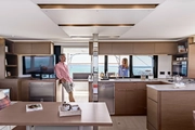 Inside, the lounge, equipped with modern kitchen appliances and comfortable seating arrangements, brings home comfort to the seas. The kitchen, where gourmet meals are prepared, stands out with its chic design and functionality, while the spacious lounge offers an ideal space for guests to enjoy special moments.